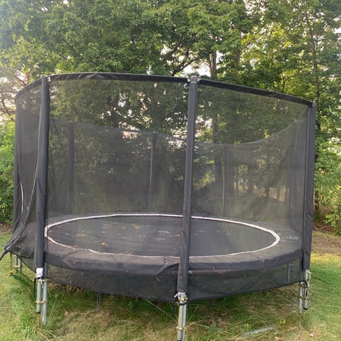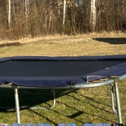Rund utomhustrampolin 4.2 meter med säkerhetsnät och stege. 10 år gammal från trampolinspecialisten. Nypris då 8.000kr. Trampolinen har metallram med ben i galvaniserat stål och fjädrar runt hoppduken. Hoppduken är svart och skyddskanten är i svart och grönt material. Säkerhetsnätet omsluter hoppytan och är fäst i stolpar runt ramen. Stege i metall ingår för enklare åtkomst. Passar för användning i trädgård eller på gräsmatta. Matta, fjädrar, nät och kantskydd har förvarats i varmgarage varje vinter. Vissa delarav nätet har mindre skador men inget som påverkar säkerheten. Även vissa skador på skumgummi rullarna som man trär över rören innan man drar på nätet. Se bilder för skick.