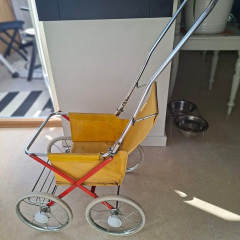 Dockvagn i vintage-stil i grön färg med gul sufflett. Vagnen har metallstativ med handtag, fyra hjul med ekrar samt dekorativt mönster på sidorna. Invändigt finns madrass och små kuddar. Passar som dekorativ inredningsdetalj eller samlarobjekt. Från 1930-talet.