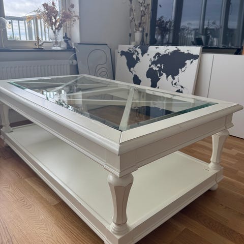 Bordet har ett dekorativt kryss med glasskiva på toppen. Panelad hylla undertill.