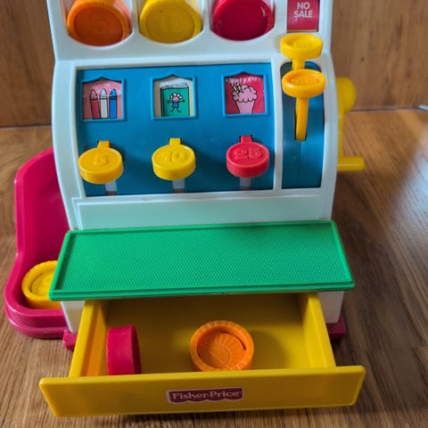 Fisher-Price leksakskassa, flerfärgad. Kassan har myntfack, utdragbar låda och vred/handtag på sidan. Framsidan har knappar med olika symboler och färger. Lämplig som rolleksleksak där barn kan låtsas handla och öva enkel räkning och sortering av mynt.