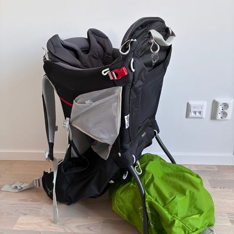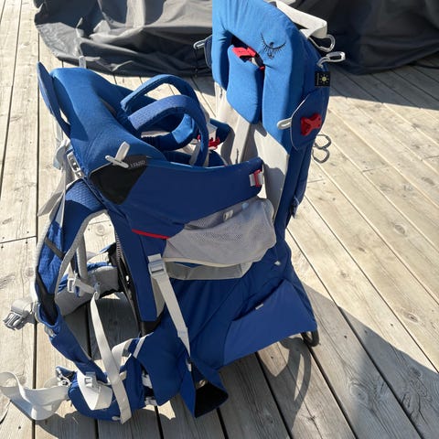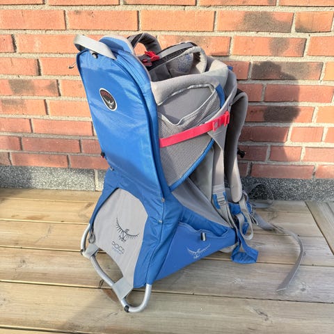 Osprey barnbärstol ryggsäck i blå färg. Ryggsäcken är utformad för att bära ett barn på ryggen vid promenader eller vandring. Modellen har vadderade axelremmar och höftbälte för bättre bärkomfort samt justerbar sittdel för barnet. Det finns solskydd/huv som kan fällas upp över barnets huvud. Ryggsäcken har även förvaringsfack för mindre packning och tillbehör. Passar lika bra för utomhusaktiviteter som på shoppingturer där barnet behöver kunna sitta säkert och bekvämt under längre tid.