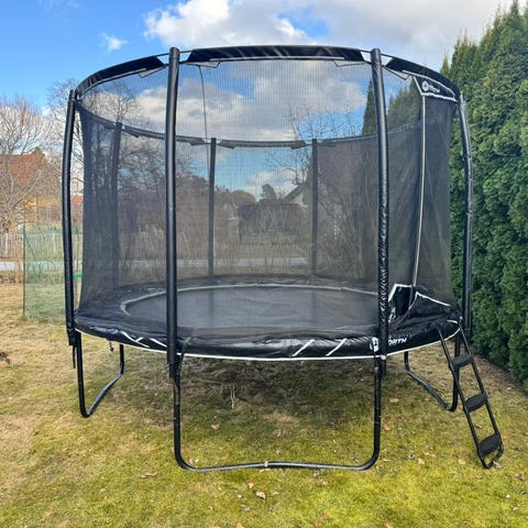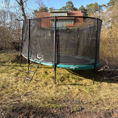 Fin rejäl studsmatta med säkerhetsnät och stege