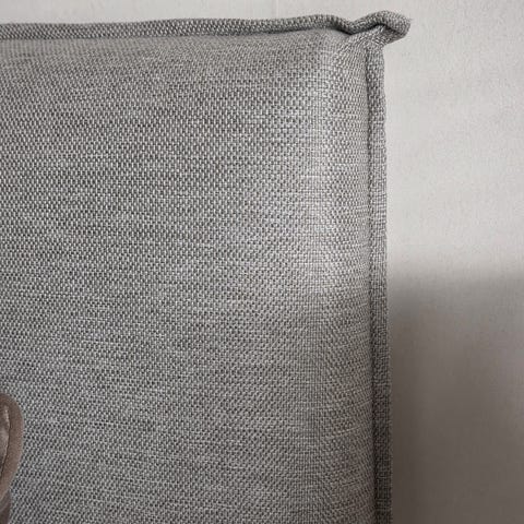 Mio sänggavel i grå textil med knapptuftad, vadderad framsida. Gaveln är avsedd att placeras bakom en säng och ger stöd för rygg och kuddar. Passar som komplement till olika typer av sängar och sovrumsmiljöer.