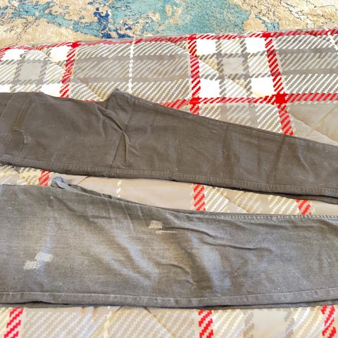 Byxorna är helt nya och aldrig använda. Sömmen har gått upp lite vid midjekanten nära dragkedjan, så det behöver sys ett par stygn där. I övrigt är de i perfekt skick.