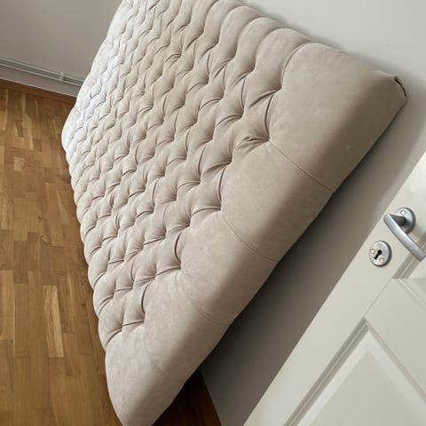 sänggavel i vadderad, knapptuftad design. Framsida i ljusrosa textil och baksida i mörkt tyg med fästen för montering mot vägg eller sängstomme. Passar som huvudgavel till säng och ger en mjuk yta att luta sig mot. I rosa sammets material, 90cm bred