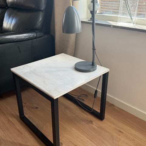 Säljer mitt soffbord i äkta marmor där skivan tyvärr spruckit som ni ser tydligt på bilderna. Det är en vit marmorskiva och ett jättefint svart underrede.