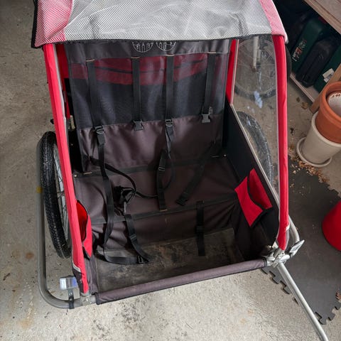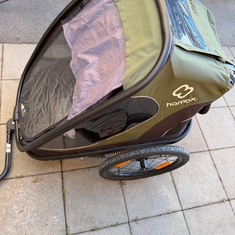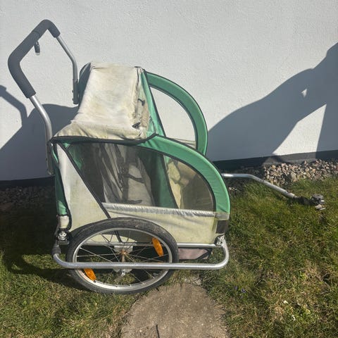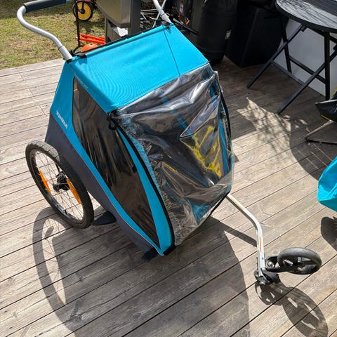 Thule cykelvagn med plats för två barn. Vagnen har turkos och svart textil med nätfront och aluminiumram. Utrustad med intern sittdel med sele samt fäste framtill för dragstång eller annat tillbehör. Passar för transport av barn bakom cykel eller som vagn vid promenader, beroende på vilka tillbehör som används.