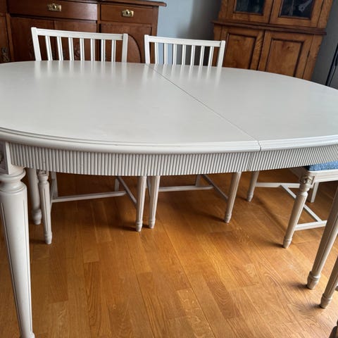 Vitt bord, 6st stolar, 2st inläggsskivor finns, är en på bilden!
