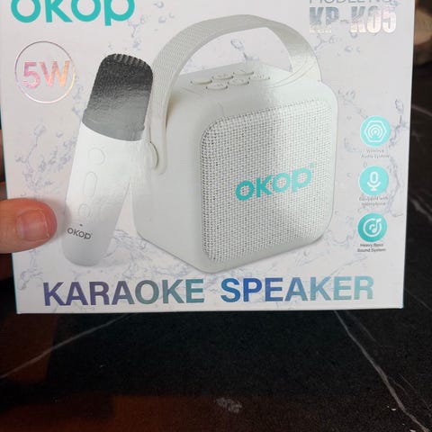 OKOP KP-K05 är en karaokehögtalare med trådlöst ljudsystem och utrustad med mikrofon. Den har ett tungt basljudsystem.