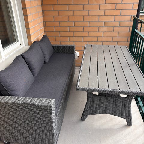 Loungebord i svart konstrotting med fyrkantig form. Bordet har en ovansida av glas som ligger ovanpå rottingstommen. Passar för användning på altan, balkong eller uteplats tillsammans med loungesoffa eller loungestolar.