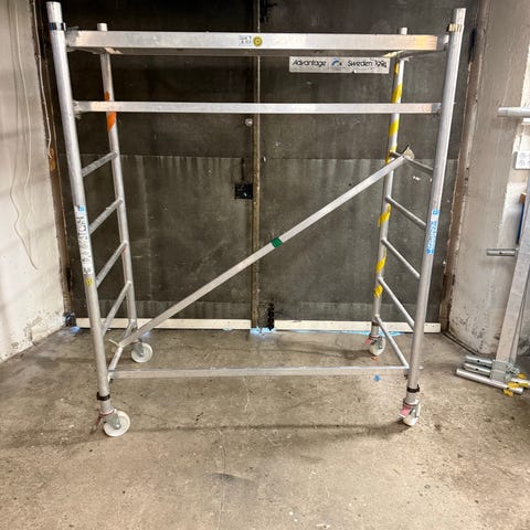 Medföljer: 3 st dubbelräcken. 4 fötter. 1 plattform med lucka. 3 st kortramar. 1 diagonalstag. Samt 1 ca 2 m ram som möjliggör arbeten både inomhus och kort till tak samt utomhus el högt till tak.