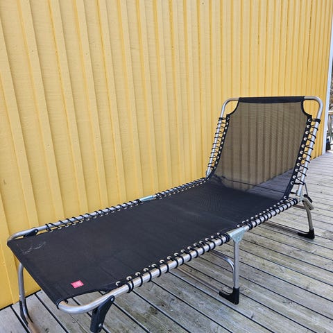 Hopfällbar solsäng med grön väv och metallram. Solsängen har justerbar ryggdel och flera benstöd för stabilitet. Den kan fällas ihop för enklare förvaring och transport, lämplig för användning på altan, balkong eller i trädgård.