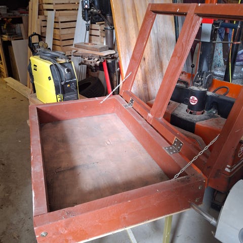 Röda träpallkragar som kan staplas och fällas ihop. Har använts för odling.
