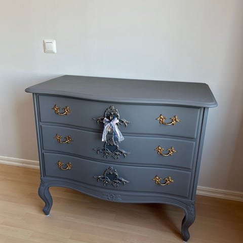 Inköpt på Bukowskis 2022. Mycket vackert ommålad rokokobyrå i svart med marmorskiva och mässingsbeslag.