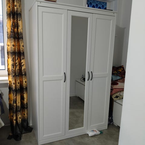 Gråa backar, 2 hyllplan och belysning medföljer. Inga skador eller skavanker.
