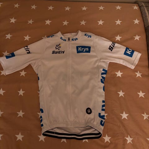 Sports cykeltröja med lång ärm i storlek S. Tröjan har svart bas med röda och vita detaljer samt grafiskt mönster. Tillverkad i tunt, syntetiskt funktionsmaterial som är anpassat för cykling. Baktill finns fickor för mindre tillbehör. Passar för cykling och annan träning utomhus.