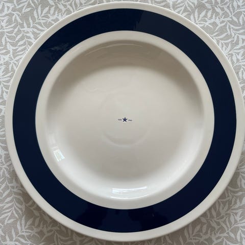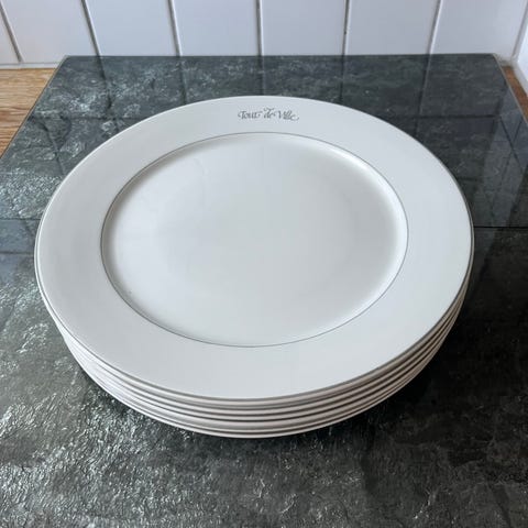 Gustafsberg tallrikar i porslin med enkel dekor längs kanten.