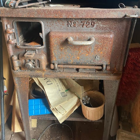 Morsø vedspis i gjutjärn, från 2015. Spisen har dekorativa gjutna mönster på sidor och front samt glaslucka framtill. Utrustad med rökrör uppåt och flera luckor för eldning och askhantering. Bottensten sprucken, (vanlig slitdel, vermikulitset köps som reservdel), se bilden. Ytrost-fläckar på ena sidan, se bild.