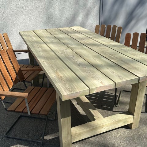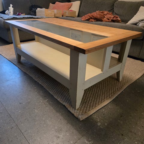 Säljer ett mycket fint och gediget soffbord i massivt trä med vitvaxad yta. 150x75 cm
