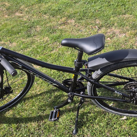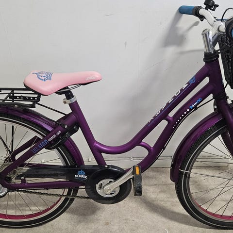 Crescent barn/ungdomscykel i svart med rosa detaljer och mönstrad sadel. Utrustad med handbroms fram, fotbroms bak, stöd och pakethållare.