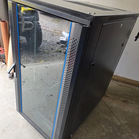 Serverskåp med plats för nätverksutrustning. Skåpet har en dörr i tonat glas och ventilationsgaller nedtill.