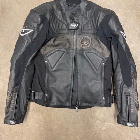 motorcykelställ bestående av jacka och byxa i gråsvart textil. Storlek48