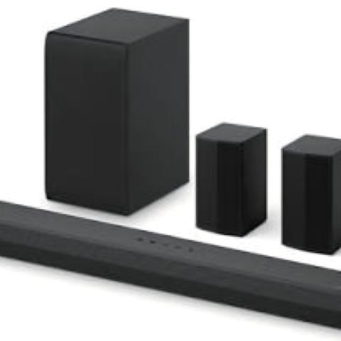 LG soundbar med tillhörande subwoofer och två bakhögtalare i svart utförande. Systemet består av en lång, avlång soundbar för placering framför tv:n, en fristående subwoofer för basåtergivning samt två mindre högtalare för surroundljud. Passar för användning tillsammans med tv, spelkonsol eller annan ljudkälla via kompatibla anslutningar beroende på modell. Designen är enkel och diskret för placering i vardagsrum eller tv-rum.