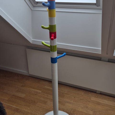 IKEA klädhängare för barn i fristående modell. Stativ i vit metall med flera rundade krokar upptill. Knopparna är i olika färger, anpassade för att barn lätt ska kunna hänga upp kläder, väskor eller ytterplagg. Passar i barnrum eller hall för förvaring av kläder och accessoarer.