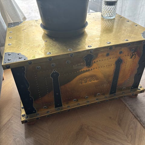 Allmogekista i trä med brunmålad yta och målad dekor i kurbits på lock och framsida. Kistan har järnbeslag och nyckelhål framtill. Invändigt finns målad text med namn, ort och datum från år 1800. Passar som förvaringsmöbel eller som inredningsdetalj i hemmet.