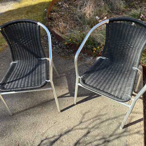 2 st svarta stapelbara stolar, Aidt från Jysk, i konstrotting med stomme i pulverlackerat stål. Konstrotting ger en naturlig flätad look, samtidigt som det är väderbeständigt och underhållsfritt. Trädgårdsstolen kan staplas för kompakt förvaring.