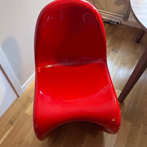 Vitra Panton Chair stol formgiven av Verner Panton. Fristående stol i röd plast med skulptural, svängd form. Passar som sittmöbel vid matbord, skrivbord eller som fristående accentstol i vardagsrum, hall eller sovrum. Tillverkad i formsprutad plast som är lätt att rengöra och flytta vid behov.