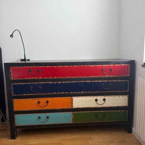 En byrå med 4 lådor och handtag i mässing. Valnöt. 1960/70-tal. Höjd 72 cm, bredd ca 59 cm, djup 42 cm. Enstaka märken, blekt på ena sidan, se bilder.