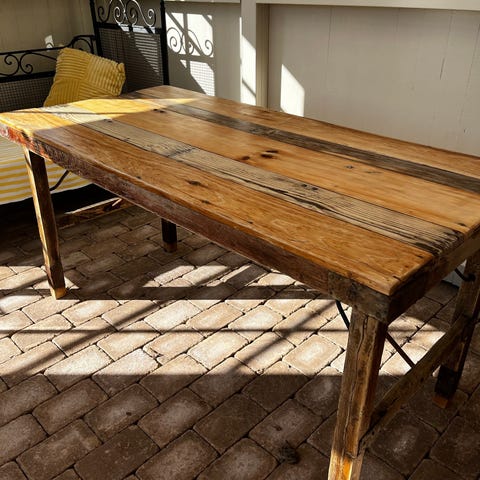 Matbord som behöver slipas och oljas. Nypris 8000kr. Två iläggskivor a 40 cm följer med.