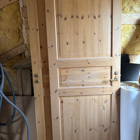 Komplett innerdörr i massiv furu. Komplett med karm, tröskel och handtag.