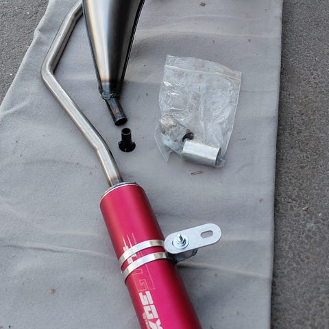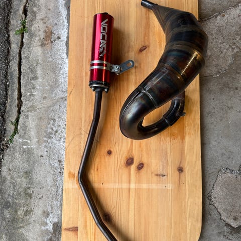 Tecnigas avgasrör och ljuddämpare till moped. Uppsättningen består av expansionsrör, röd ljuddämpare samt tillhörande fästen och delar enligt bild. Har haft den på Rieju drac dm PRO innan. Pluggen urmonterad ny pris 2500:- läs mer på www.twostroke.se