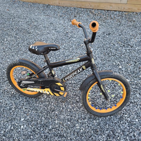 Crescent barncykel med 16" hjul. Cykeln har orange ram med svarta detaljer, fotbroms bak och handbroms fram. Utrustad med kedjeskydd, reflexer och styre med nummerplatta framtill. Passar barn som behöver en mindre cykel med 16-tums hjulstorlek.