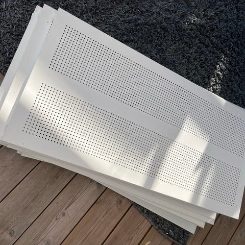 Förvaringspaneler i med massor av tillhörande krokar. Panelerna kan användas för upphängning och organisering av olika föremål, till exempel i förråd, garage eller hobbyrum. Krokarna monteras i hålen på panelerna och kan flyttas vid behov för att anpassa förvaringen efter olika typer av saker.