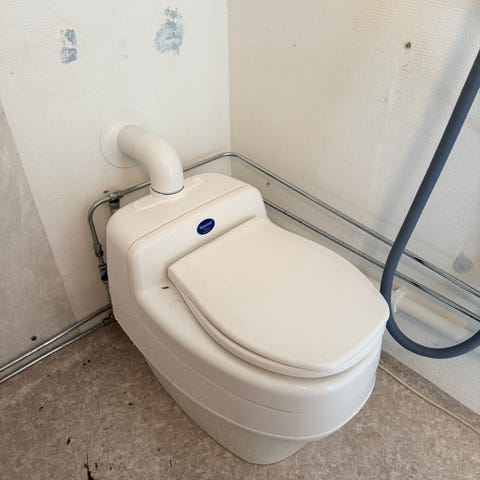 Passar för exempelvis fritidshus, kolonistuga eller liknande där vatten och avlopp saknas. På bilderna syns även vissa yttre märken och repor på höljet. Säljs tillsammans med tillhörande behållare och delar som visas på bilderna.