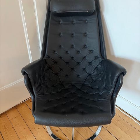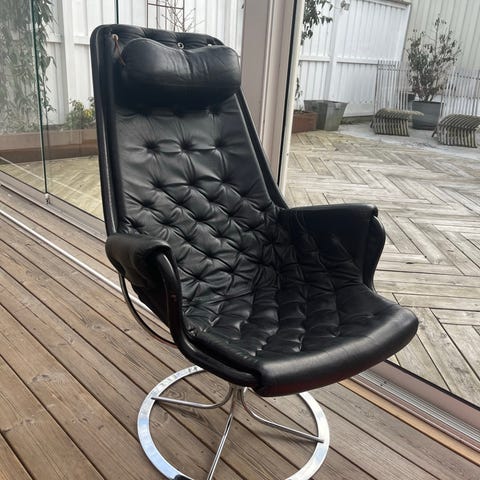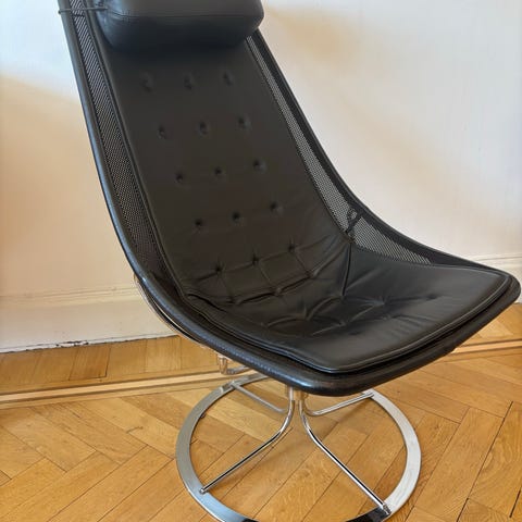 DUX Bruno Mathsson Jetson fåtölj i svart läder med snurrunderrede i metall. Fåtöljen har hög rygg med integrerat nackstöd och knappsömmar i sits och rygg. Passar som loungefåtölj eller läsfåtölj i vardagsrum, sovrum eller arbetsrum.