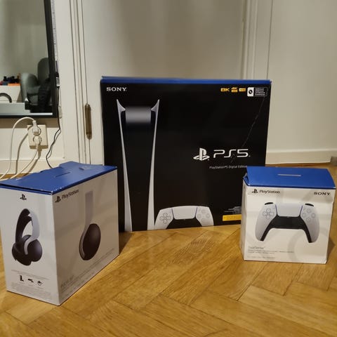 Sony Playstation 5 spelkonsol. Stationär spelkonsol avsedd för TV-spel. På bilden syns även ett Steelseries-headset och spelet EA Sports FC, men huvudprodukten är en Playstation 5-konsol. Lämplig för spel, underhållning och mediauppspelning.