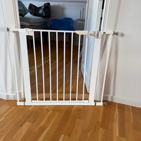 Barngrind i vit färg. Grind med vertikala spjälor, avsedd för barnsäkring av exempelvis dörröppningar eller andra passager i hemmet. Vi har haft den för trappen.
