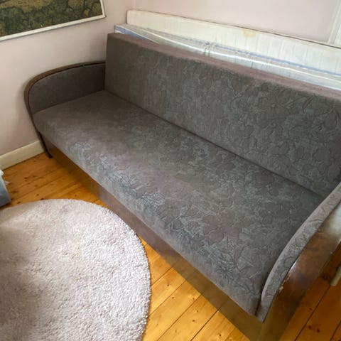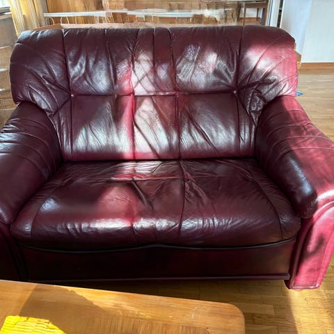 Hela soffan är i vinrött läder, finns ett parti i sittdynan med slitage. Se bild.
