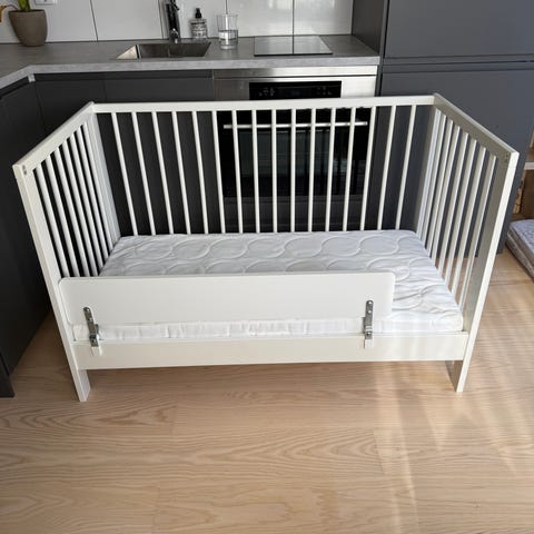 IKEA SUNDVIK spjälsäng i vit färg. Klassisk spjälsäng med ribbor på sidorna och en öppningsbar sida med säkerhetsbräda som kan användas när barnet blir större. Passar standard spjälsängsmadrass.