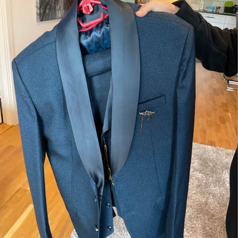 SAND Copenhagen Star-Craig kostym för herr i storlek 48. Kostymen är blå och tillverkad i mohairblandning. Modellen har normal passform med tvåknäppt kavaj, slag med bröstficka samt framfickor med lock. Byxorna är raka med pressveck. Passar för formella tillfällen som arbete, fest och högtider.