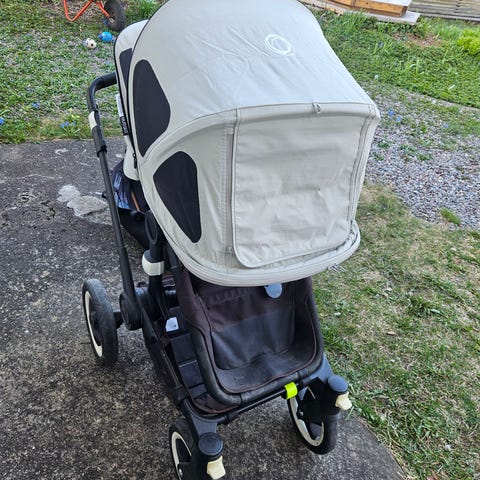 Bugaboo barnvagn med både liggdel och sittdel i blått tyg. Vagnen har fyra hjul och justerbart handtag. Liggdel och sittdel kan användas efter behov från nyfödd till större barn. Det medföljer en Bugaboo high performance åkpåse enligt förpackningen på bilden. Passar för vardagsbruk, promenader och transporter av barn i olika åldrar.