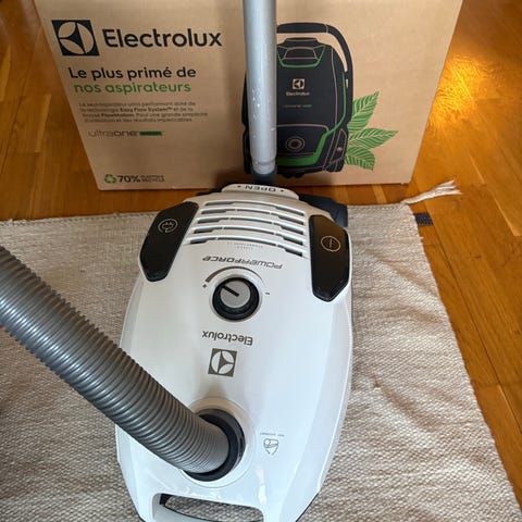 Electrolux Z3369p dammsugare i röd färg. Modellen är en kompakt golvdammsugare med teleskoprör, slang och munstycke för rengöring av golv och andra ytor i hemmet. Dammsugaren är avsedd för torrdammsugning och använder dammsugarpåsar. På ovansidan finns reglage för styrning samt bärhandtag. Passar för vanlig städning i hushållsmiljö.