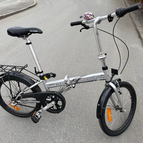 Kompakt & lätt att fälla ihop. Transportväska ingår. Har pakethållare + sadelväska.
