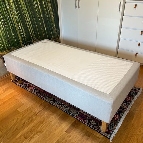 IKEA Sultan Sagvåg resårbotten i storlek 90x200 cm. Resårbotten har vit klädsel och står på ben i trä. Undersidan består av en träram med ribbor. Passar som enkelsäng eller som del i en dubbelsäng tillsammans med ytterligare en resårbotten i samma storlek. Används tillsammans med bäddmadrass för ökad komfort.