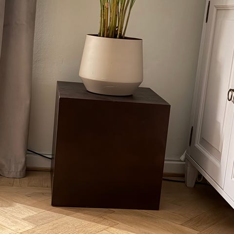 Sideboard/bord i mörk valnöt. Bordet har en fyrkantig bordsskiva samt en förvaringslåda. Passar som soffbord eller sidobord.