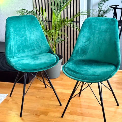 6 st eleganta stolar i mörkgrön sammet med svarta ben.